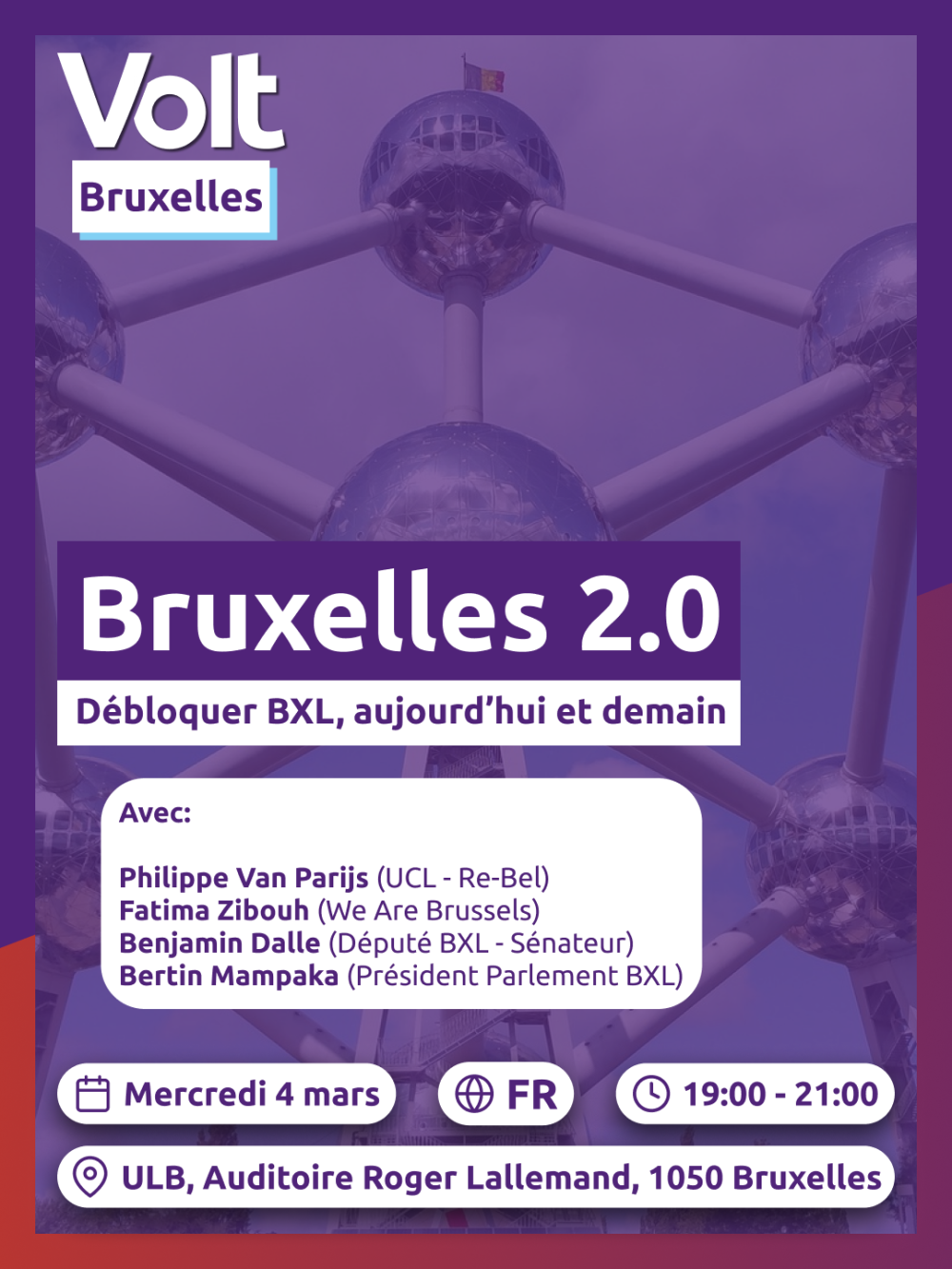 Volt vous invite à un débat de fond pour explorer des solutions concrètes et innovantes pour l’avenir de notre chère capitale. Il rassemblera la connaissance académique, l’engagement de la société civile, ainsi que l’expérience de terrain politique. Avec vous, nous réfléchirons à quoi doit ressembler Bruxelles 2.0.