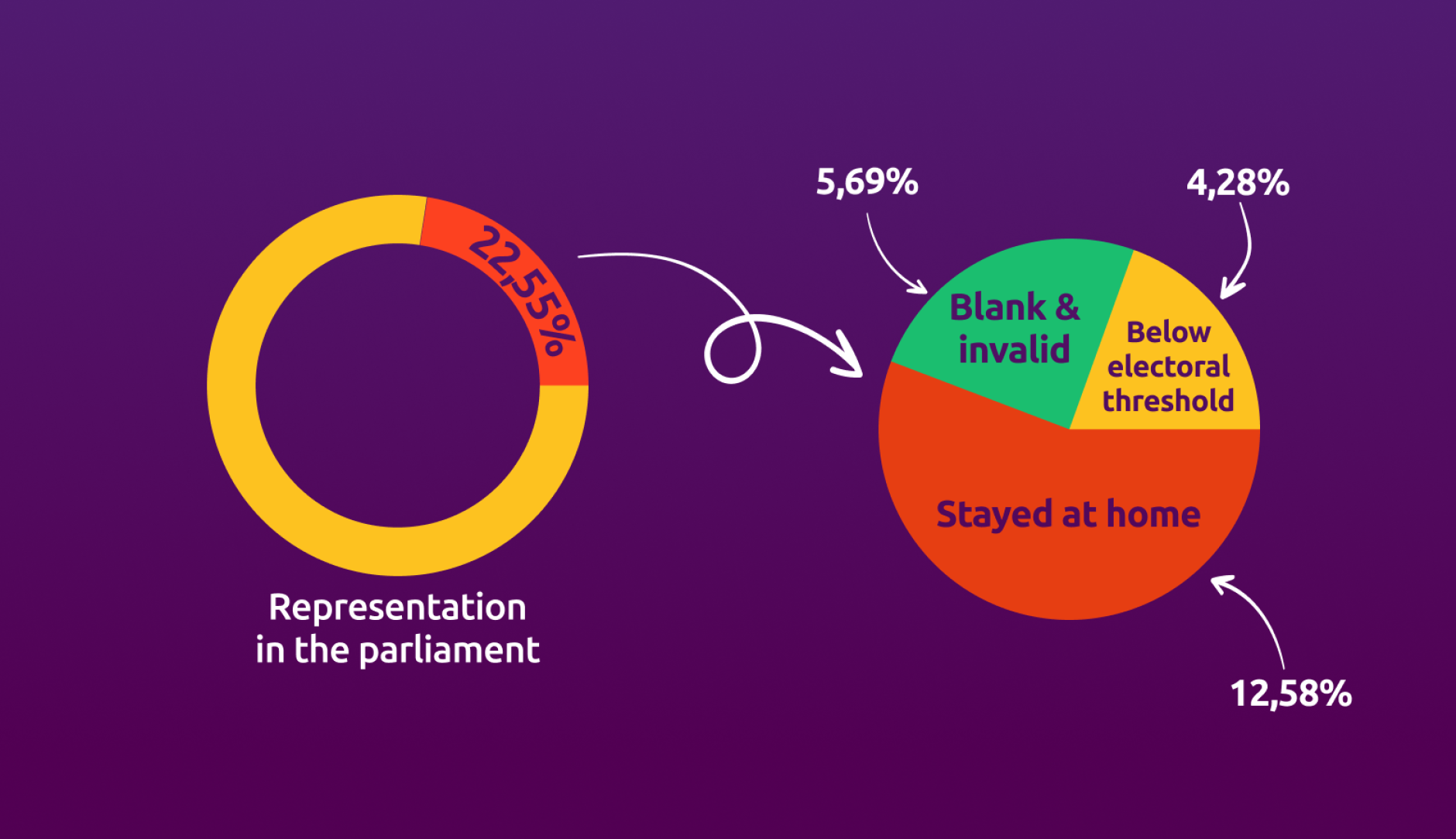 Elections are seen as legitimizing the status quo, not as a means for citizens to choose their own government and bring about change. Despite compulsory voting, on June 9, one in eight voters—or 12.58%—remained home. Another 5.69% voted blank or invalid, and 4.28% of the votes went to parties that didn’t make the electoral threshold. This means that 22.55% of the voters are not represented in Belgian politics. An even larger part of the votes went to extremist parties, in large part as protest. That should be more than enough reason for all parties to make democratic renewal a core theme.